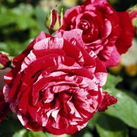 Роза флорибунда Дип Импрешн (Deep Impression) - замечательная новинка, ценная благодаря своей уникальной окраске. Цветки темно-красные с розовыми штрихами и полосками. Куст густой, ветвистый, округлой формы. Активно нарастает начиная со второго года после посадки. Листва темно-зеленая, блестящая. Легкий аромат малины.